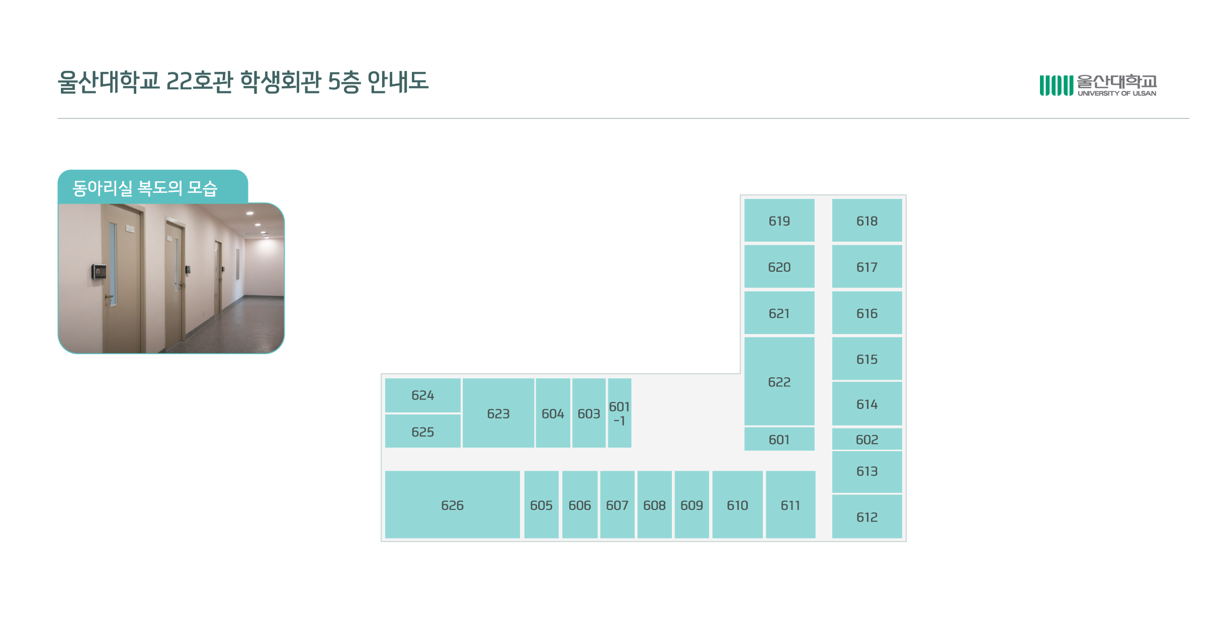 22호관 5층에는 다양한 학생 단체가 활동하는 공간이 모여 있습니다.