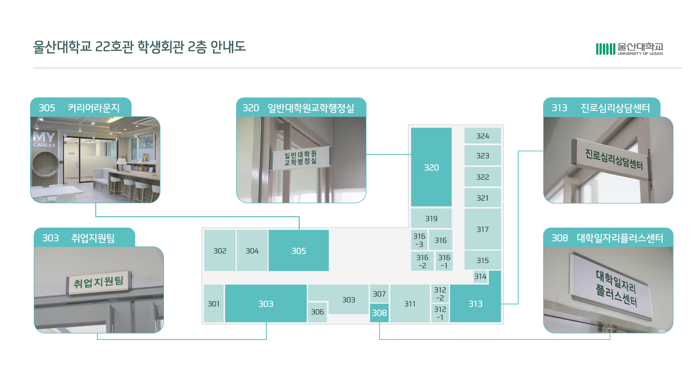 22호관 2층에는 학생들의 진로 탐색과 취업 준비를 지원하는 공간이 마련되어 있습니다.