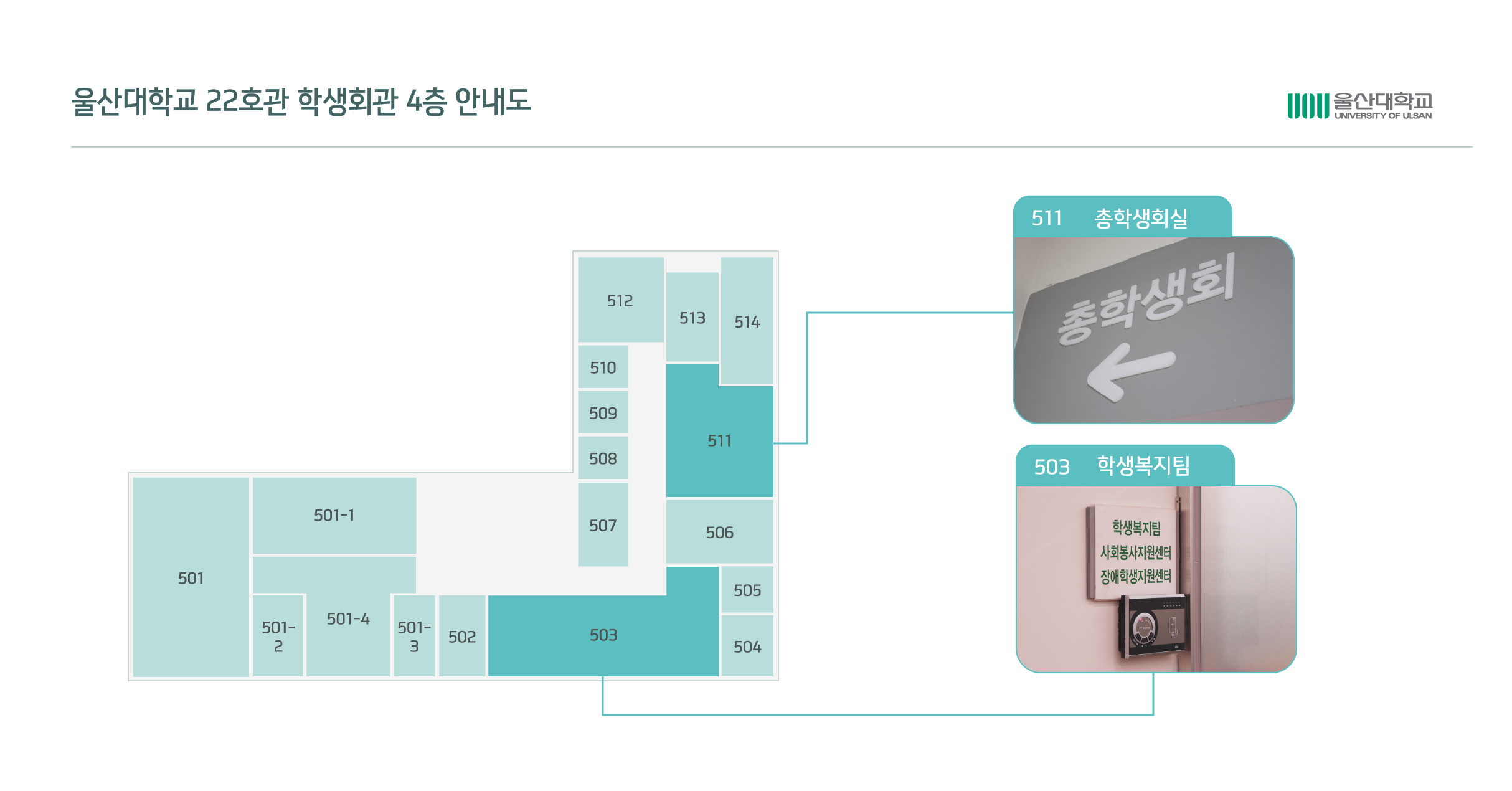 22호관 4층에는 학생 복지와 학생 자치 활동을 담당하는 부서가 있습니다.