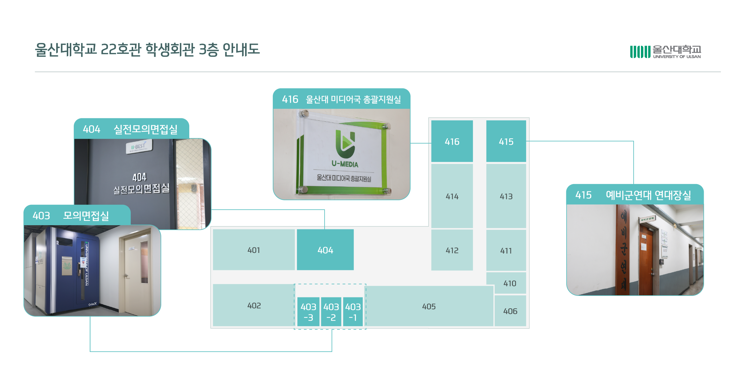22호관 3층에는 대학의 미디어 콘텐츠 제작을 담당하는 울산대미디어국과 예비군 관련 업무를 담당하는 예비군연대가 위치해 있습니다.