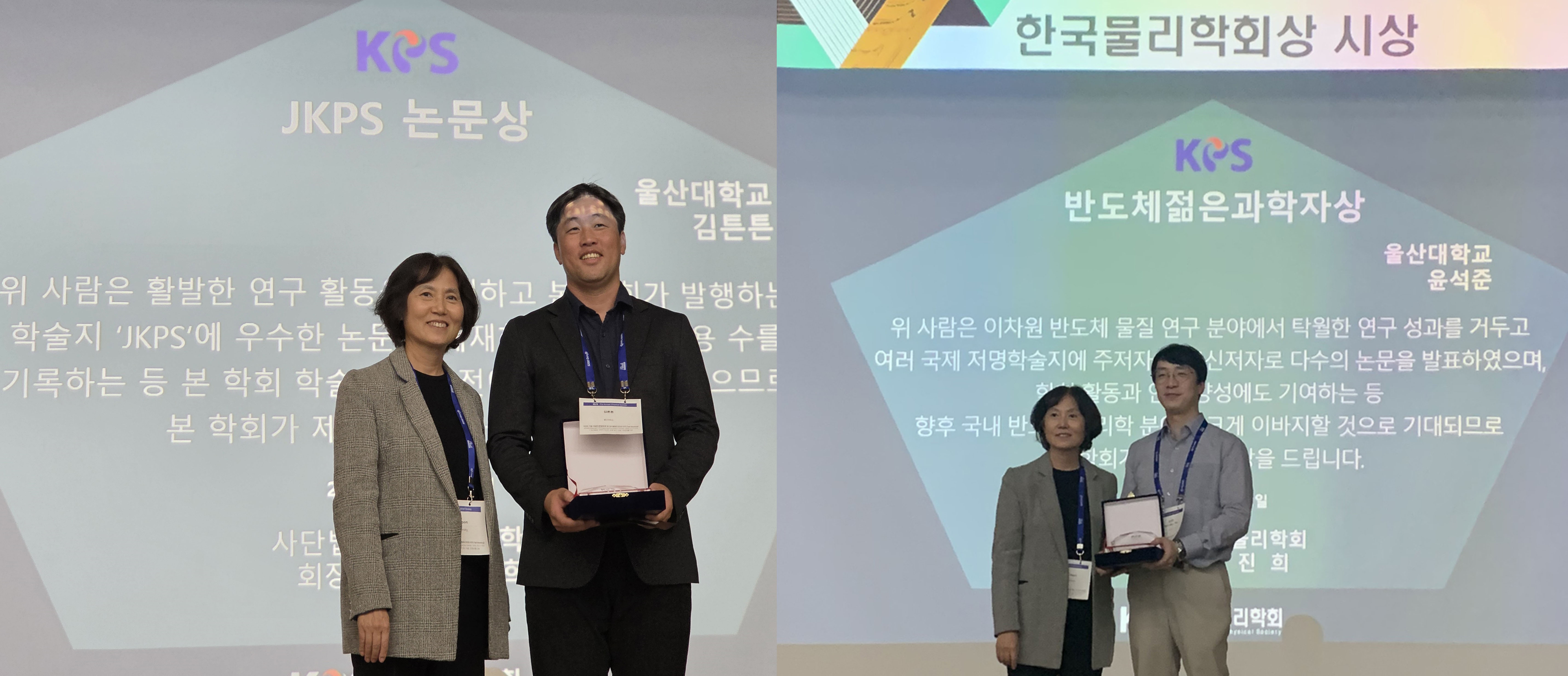울산대학교 연구진이 기초과학과 첨단 반도체 분야에서의 연구 역량을 다시 한번 입증했다. 울산대학교(총장 오연천) 신소재·반도체융합학부 김튼튼 교수와 윤석준 교수는 지난달 22일 광주 김대중컨벤션센터에서 열린 ‘2025 한국물리학회 추계학술대회’에서 각각 ‘JKPS 논문상’과 ‘젊은반도체과학자상’을 수상했다.
