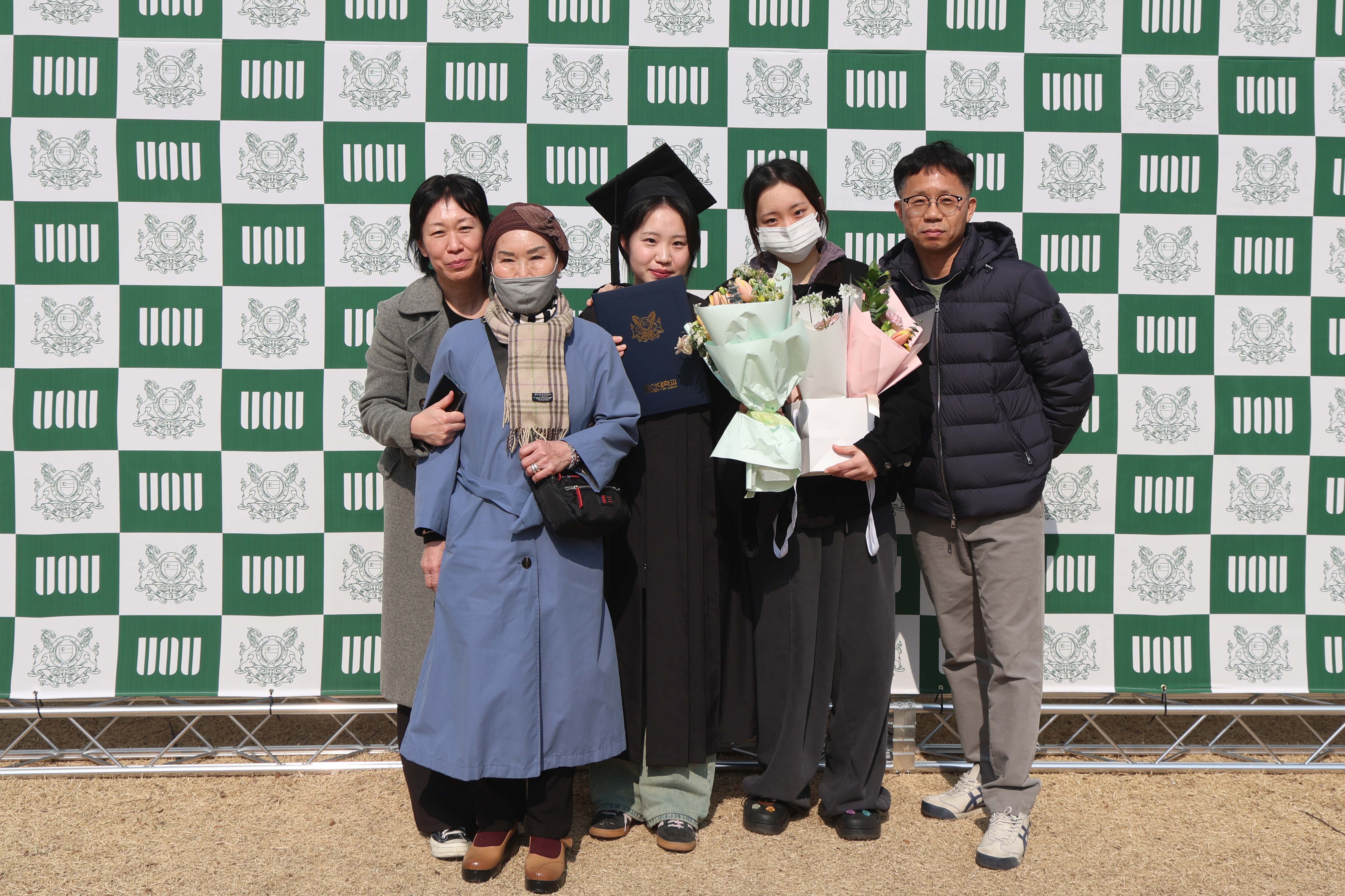 울산대 졸업생, 가족, 친구들이 교내 중앙정원에 마련된 포토존에서 졸업을 축하하는 사진 촬영을 하는 모습