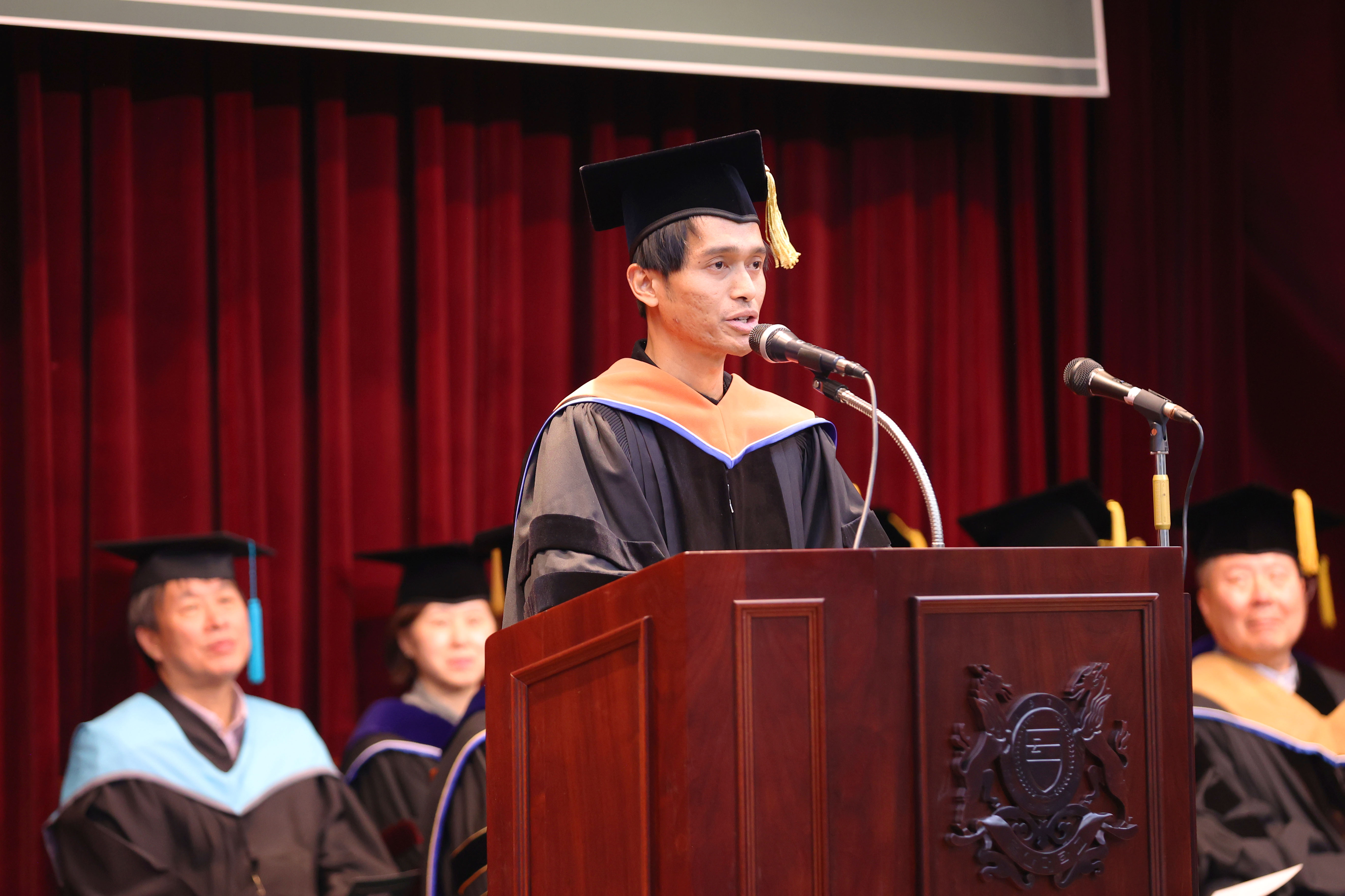 울산대 전기전자정보시스템공학에서 박사학위를 받는 프리아다 나아드리(34) 씨가 졸업생을 대표해 답사를 하고 있다.