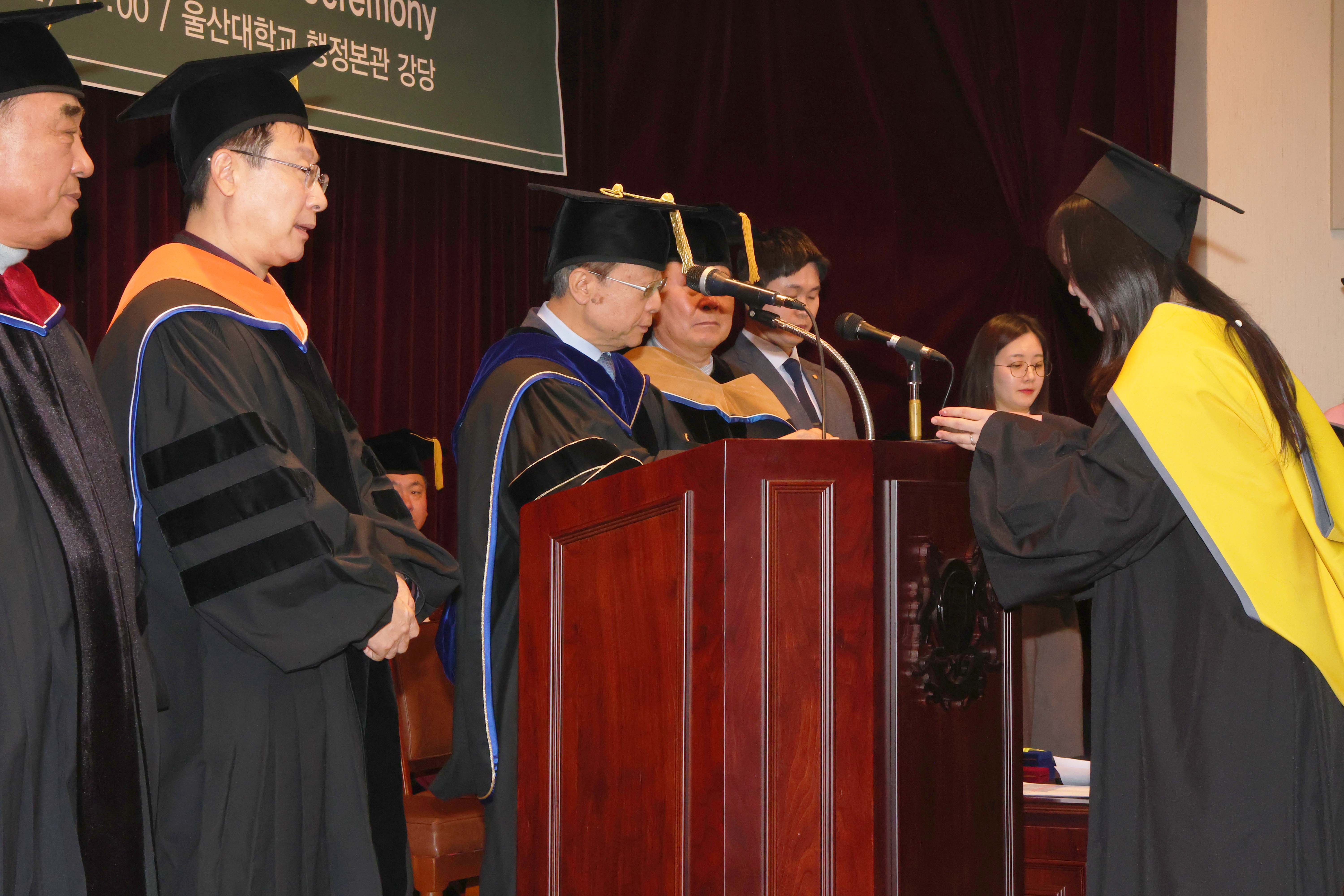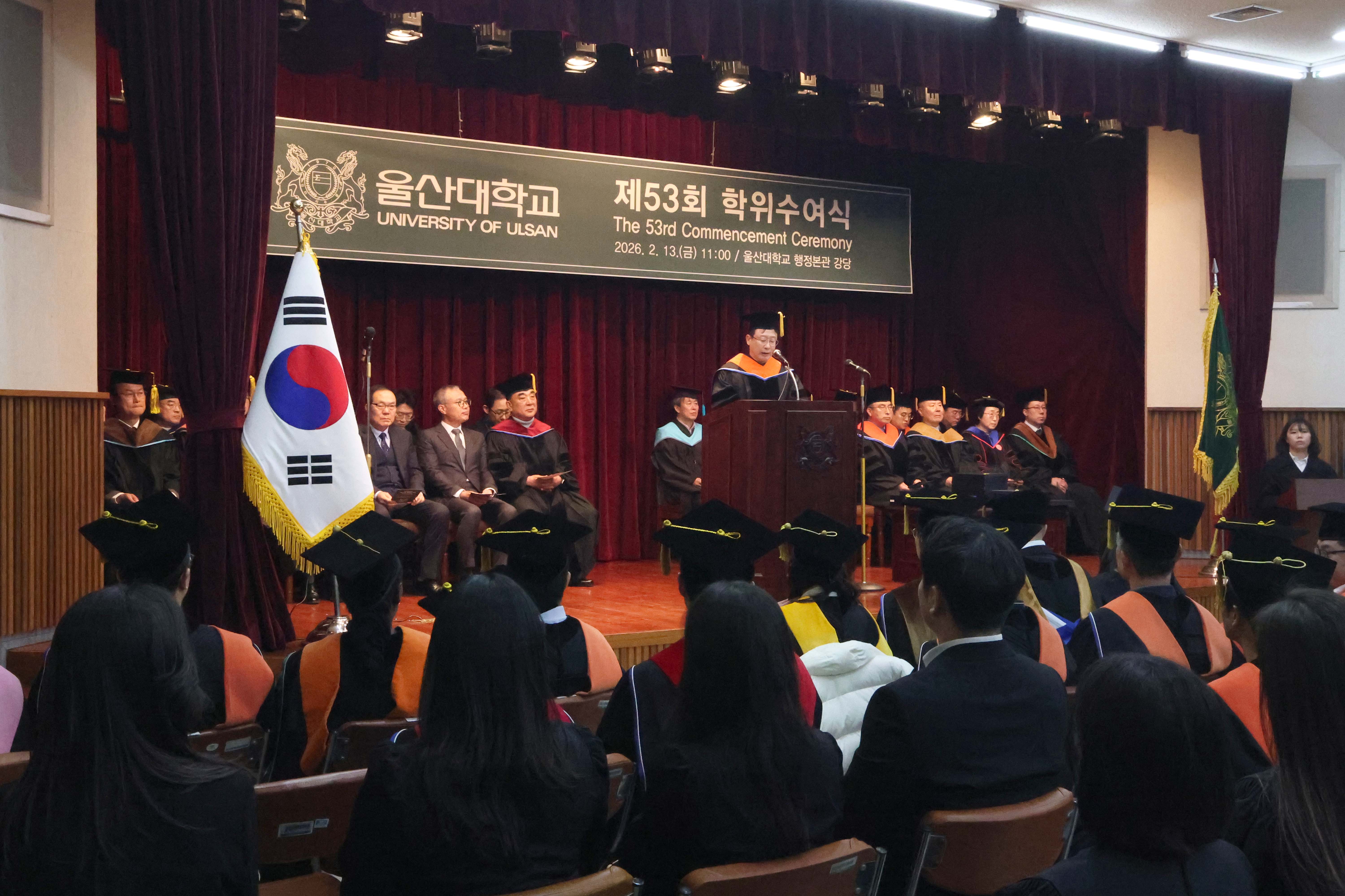 오연천 총장은 “오늘은 배움의 결실을 넘어 더 큰 책임을 시작하는 날”이라며 “인간 존중과 겸손의 가치를 바탕으로 꾸준히 정진해 달라”고 말했다. 김두겸 울산광역시장은 “대학에서 쌓은 역량을 바탕으로 지역에 뿌리내려 울산 발전을 이끄는 인재로 성장하길 바란다”고 말했다.
