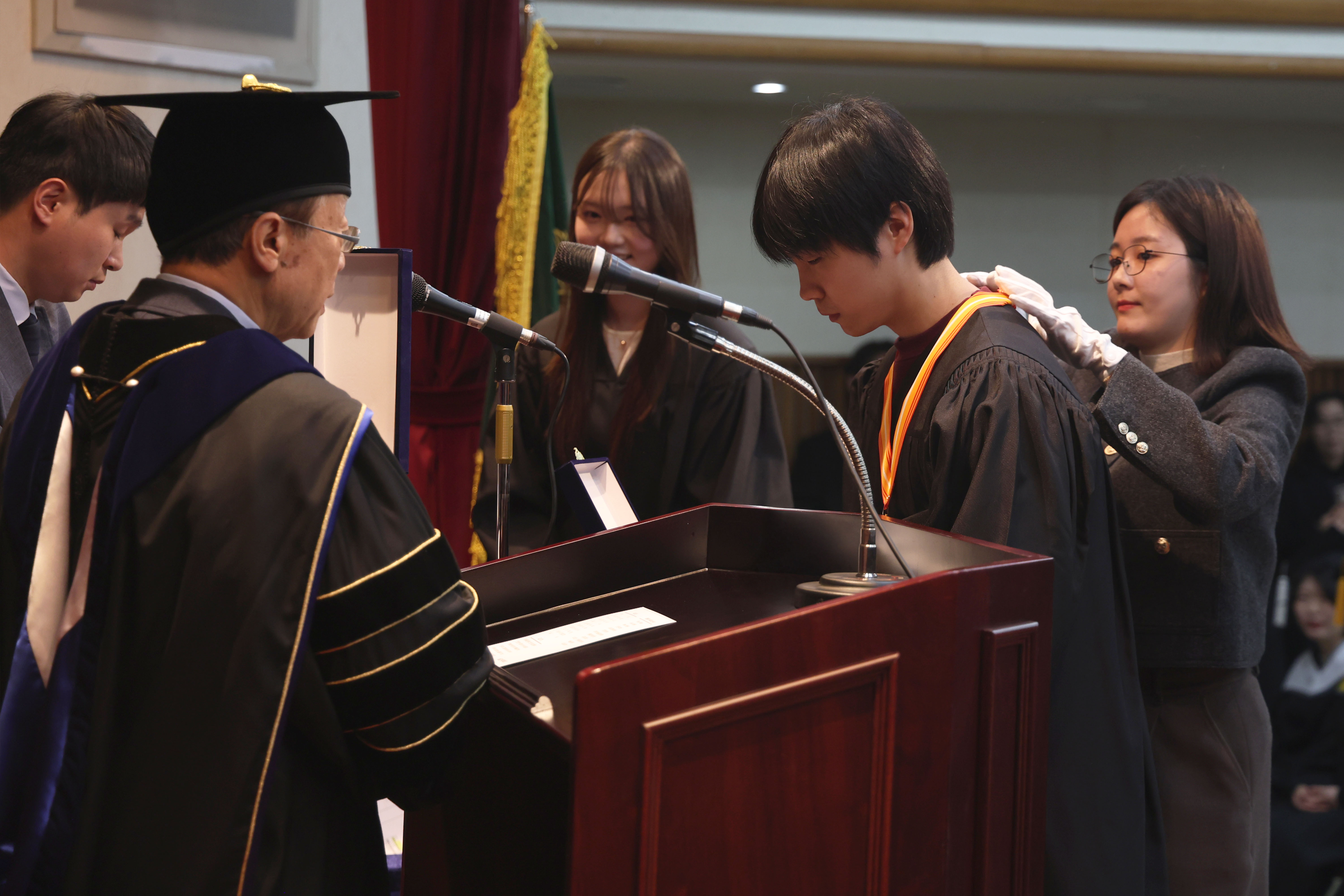 오연천 총장이 이사장상을 받는 백승찬(25) 씨에게 이사장상과 메달을 수여하고 있다.