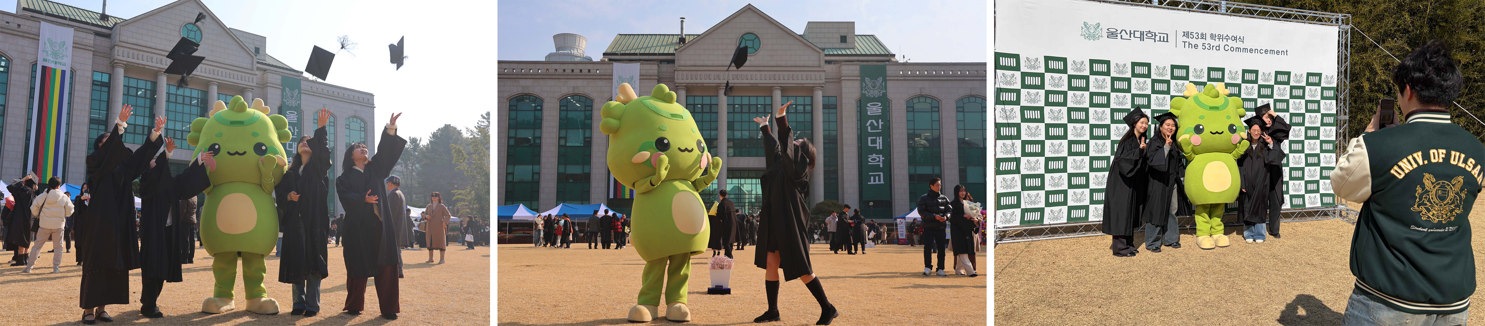 행정본관 뒤 중앙정원에서 졸업생들이 울산대 대표 마스코트 캐릭터 '울리니'와 함께 촬영을 하는 모습