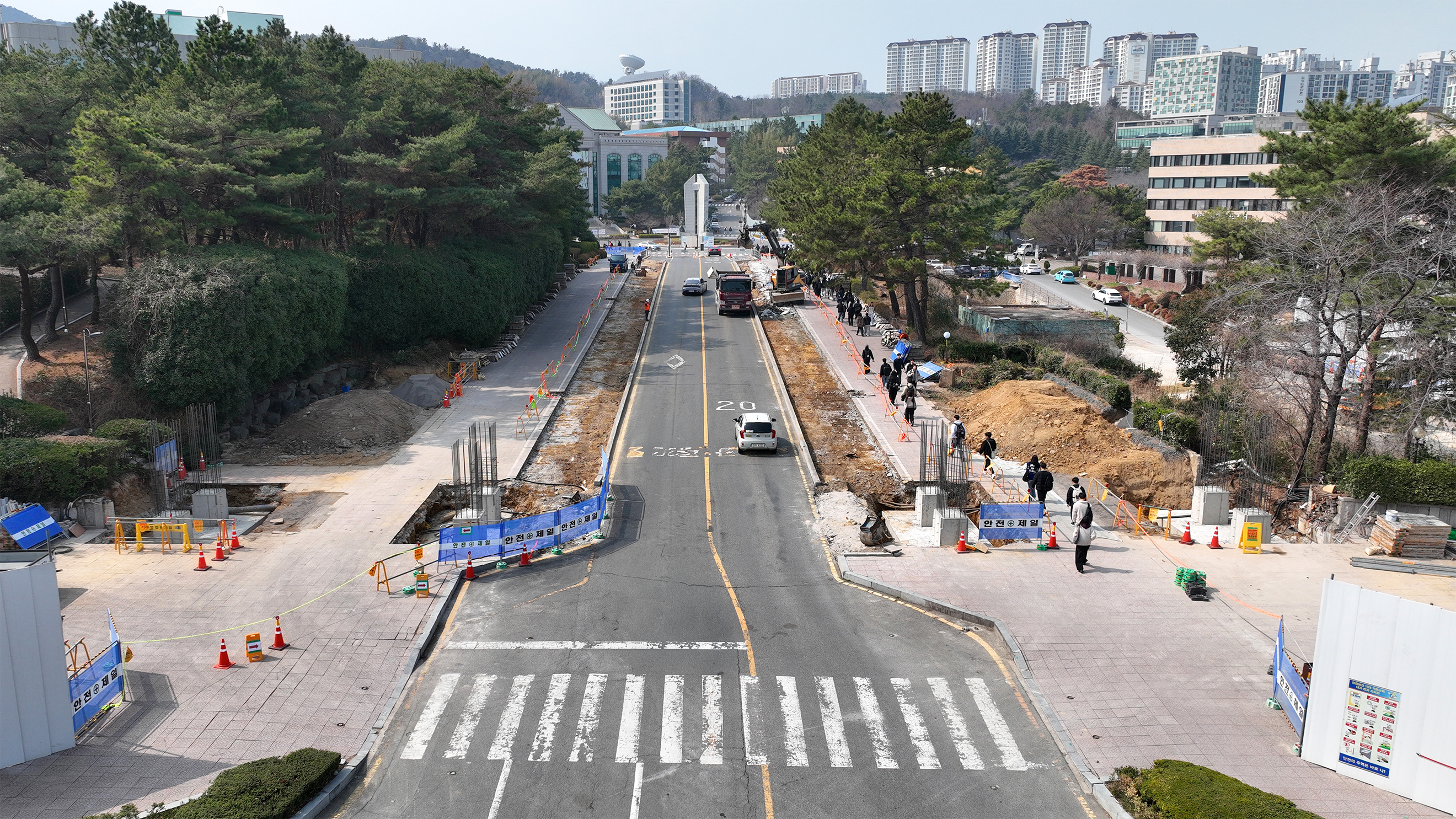 캠퍼스 출입 환경을 개선하기 위한 정문 및 진입로 확장공사도 함께 진행되고 있다. 이번 공사는 정문 문주 이설과 진출입 도로 확장, 수위실 및 파고라 철거 등을 포함한다. 특히 기존 2차선 도로를 4차선으로 넓혀 진입 1차선, 진출 3차선 체계로 운영할 예정이어서, 정문 일대 차량 흐름이 한층 원활해질 것으로 기대된다. 현재는 문주 기초 콘크리트 시공이 진행되고 있으며, 공사 기간은 2026년 2월부터 5월까지다.