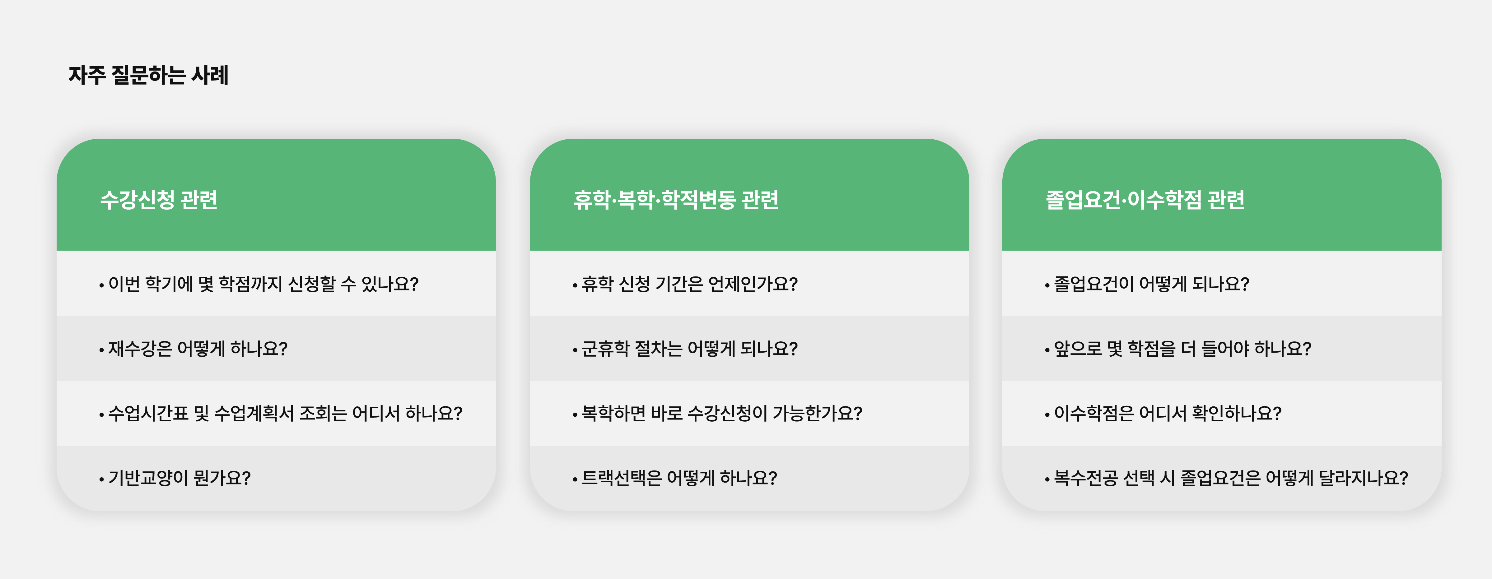 학기 초에 학생들이 가장 많이 묻는 질문은 크게 세 가지로 나뉩니다. 수강신청, 휴학·복학, 그리고 졸업요건입니다. 실제 운영 과정에서도 이 세 분야의 문의 비중이 가장 높습니다.