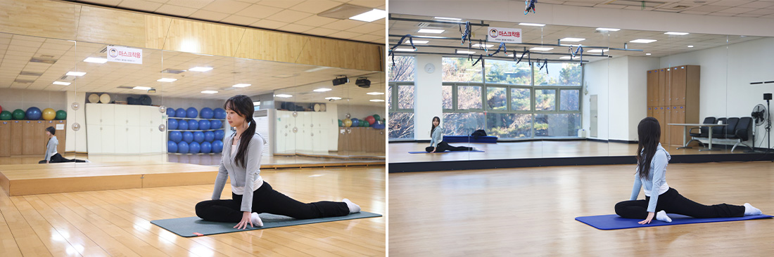 아산스포츠센터 내 스포츠 교실에서 필라테스를 하고 있는 수강생 모습