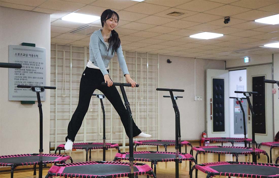 1층 스포츠 교실에서 트램펄린 피트니스로 운동하는 수강생 모습