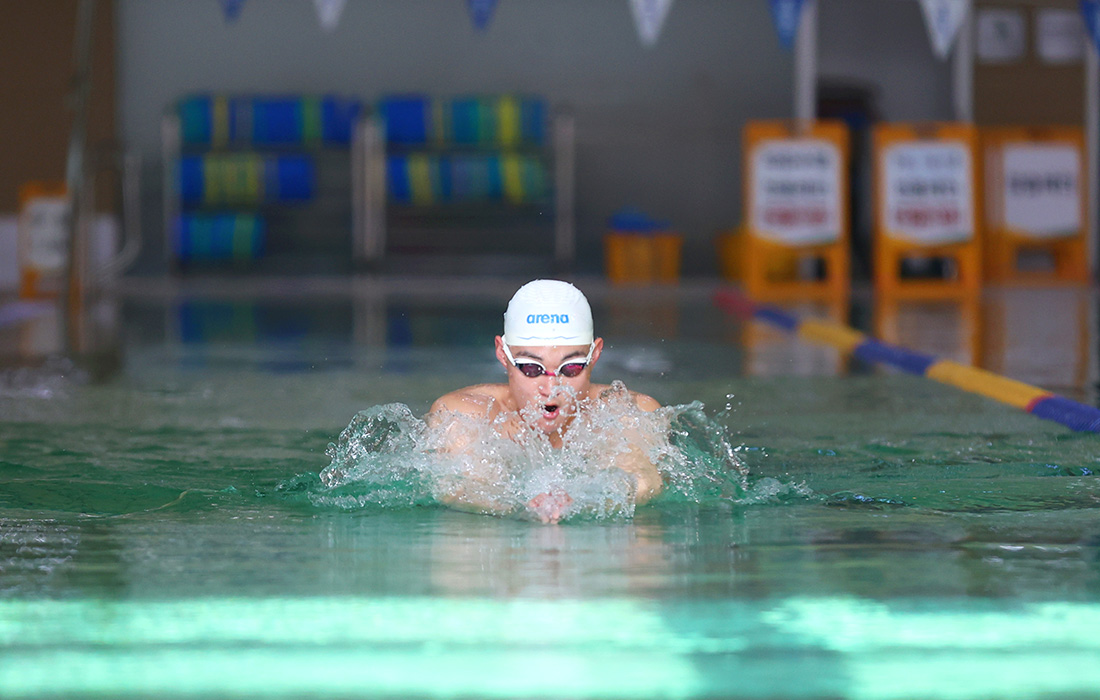 1층 수영장에서 평영 자세를 시범 보이는 이현석 강사