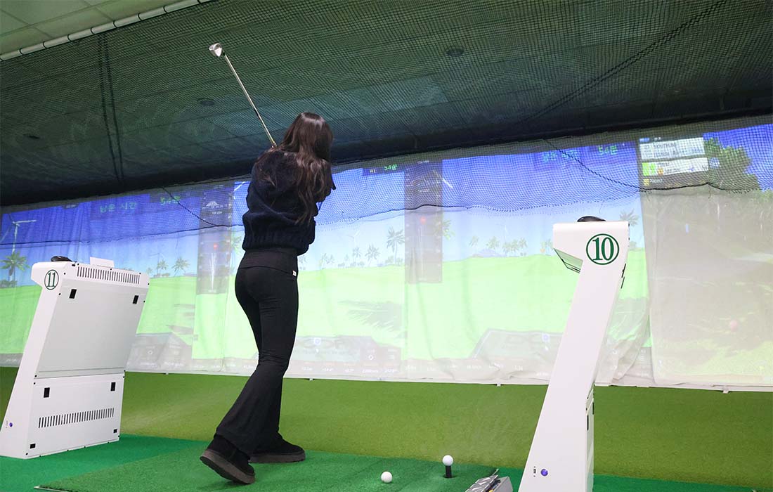 2층 실내골프연습장에서 스윙하는 수강생의 모습
