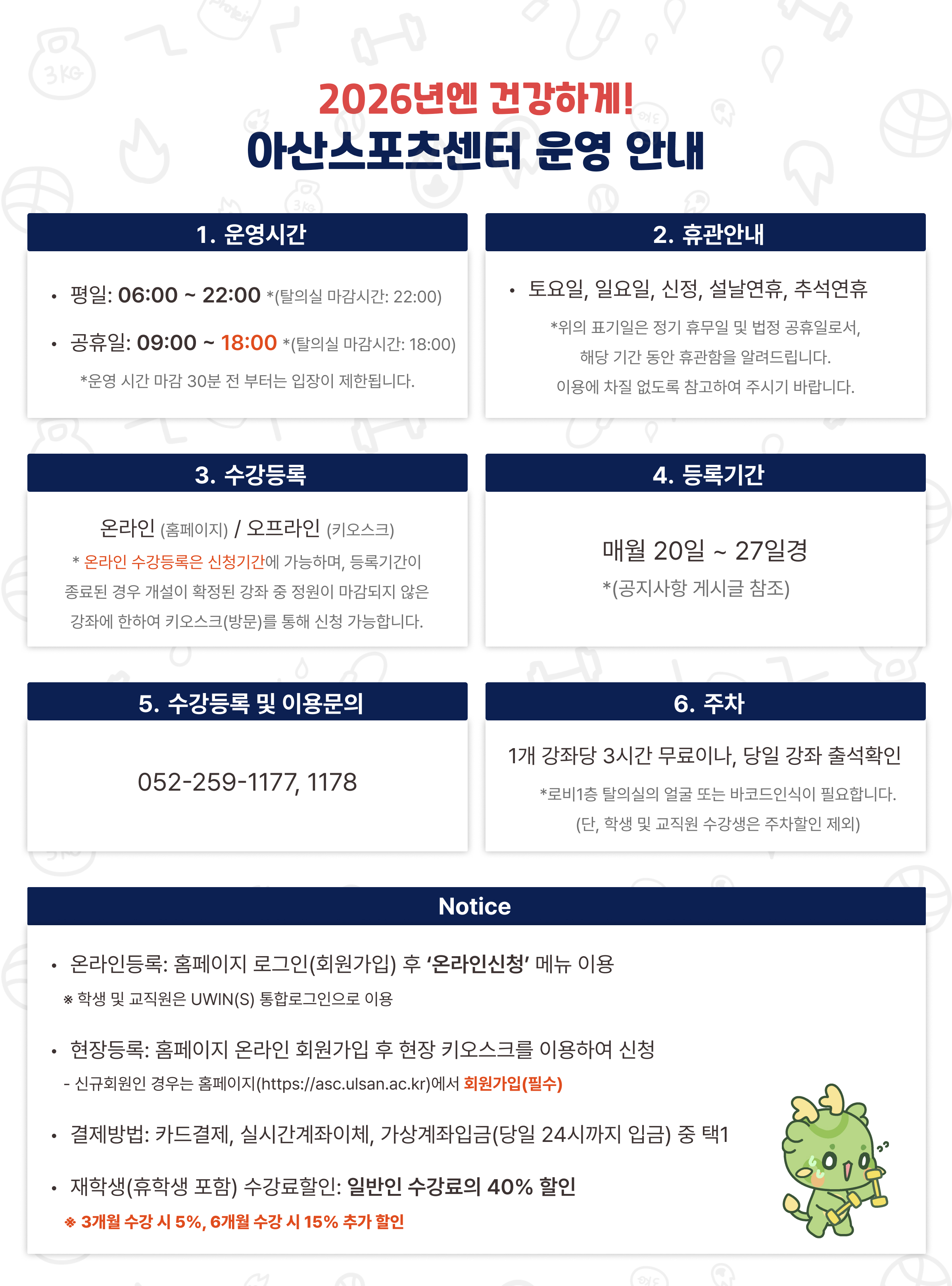 자세한 사항은 아산스포츠센터 홈페이지를 통해 확인하실 수 있습니다. [아산스포츠센터 홈페이지 바로가기]