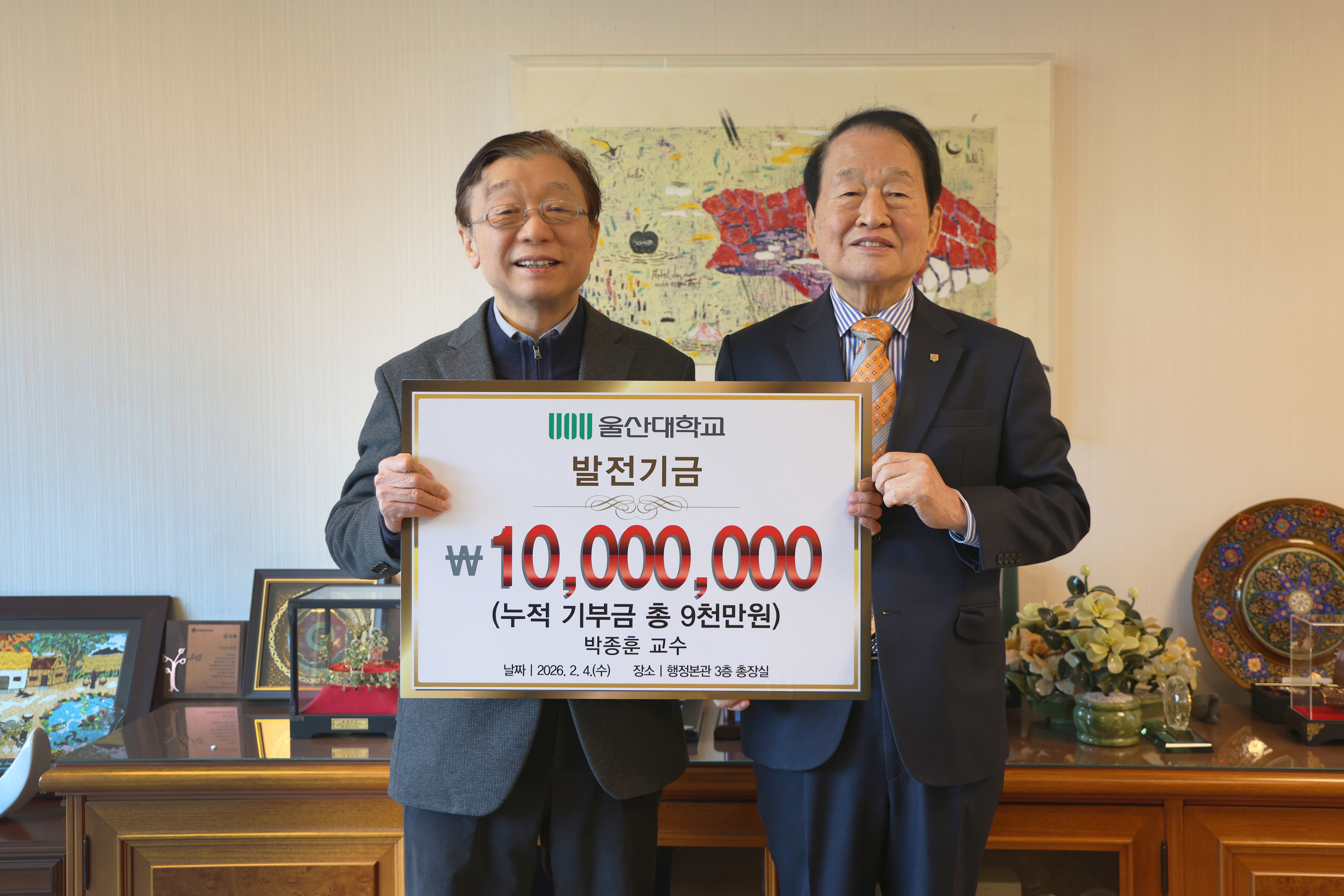 울산대는 2026년 2월 총장실에서 발전기금 전달식을 마련해 박종훈 교수의 뜻깊은 나눔에 감사의 마음을 전했습니다. 이날 전달식은 오랜 시간 대학과 학생들을 위해 헌신해 온 박종훈 교수의 발자취를 되새기고, 그 의미를 함께 나누는 뜻깊은 자리로 마련됐습니다.